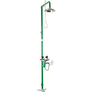 Аварийная душ предназначен для заводов, фабрик, лабораторий, где есть риск нанесения здоровья рабочему персоналу от огня, кислот, и прочих химических или радиоактивных реагентов. Раковина приводится в действие с помощью бокового рычага, душ с помощью ручки.