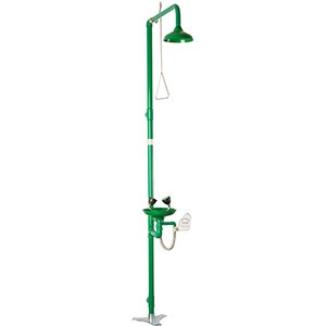 Аварийная душ предназначен для заводов, фабрик, лабораторий, где есть риск нанесения здоровья рабочему персоналу от огня, кислот, и прочих химических или радиоактивных реагентов. Раковина приводится в действие с помощью бокового рычага, душ с помощью ручки.