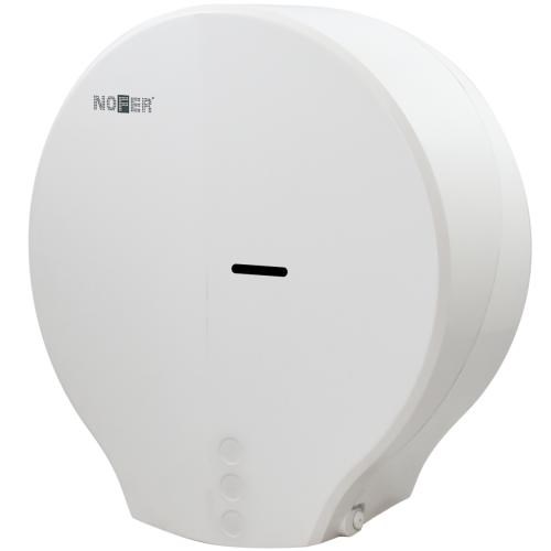 Диспенсер для туалетной бумаги в рулонах 500 м, диаметр 280мм выполнен из ABS- пластика белого цвета, смотровое окошка уровня контроля туалетной бумаги , замок ,фронтальная загрузка рулона бумаги.