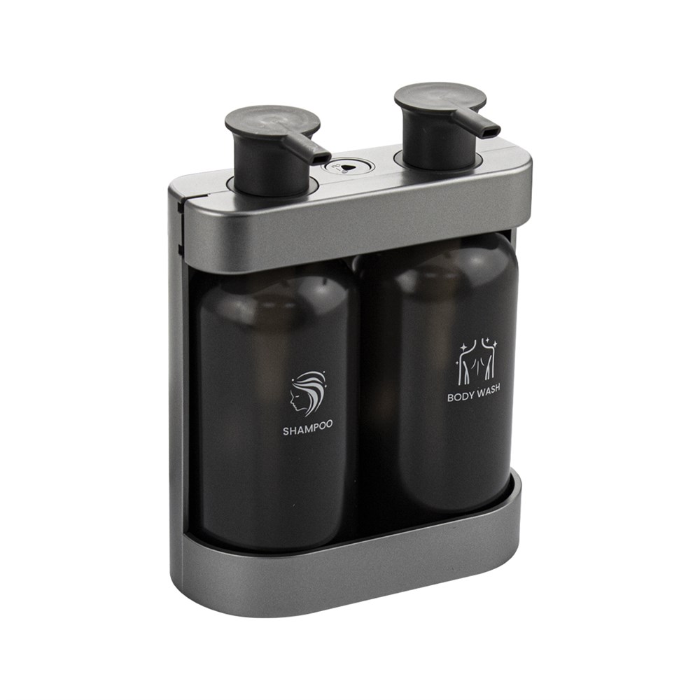 Дозатор устанавливается в туалетные комнаты, душевые, особенность этого дозатора жидкого мыла - это наличие пары отсеков. Каждый отсек можно наполнить разными средствами: жидким мылом, гелем для душа. Хромированный цвет каркаса и затемненные емкости для мыла создают прекрасный внешний вид, сочетающийся со множеством помещений. Корпус диспенсера изготовлен из прочного пластика АБС серебристого цвета, который выдерживает различные механические воздействия. Дозатор оснащен двумя съёмными ёмкостями объёмом 380 мл каждая