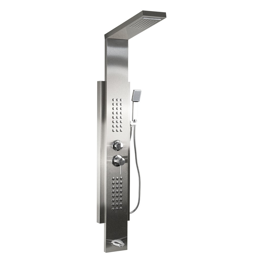 Ультрамодная дизайнерская разборная, гидромассажная душевая панель - "тропический душ" с двумя лейками и форсунками, 4 режима работы, с коротким изливом. Функциональность обеспечивают тропический, верхний каскадный душ, ручная лейка и форсунки для массажа спины. Эффектный внешний вид и практичность эксплуатации придает изделию из нержавеющей стали марки 304 матовая зацарапанная поверхность. Сочетание эстетики и максимального комфорта достигается за счет интегрированных гидромассажных форсунок и встроенного верхнего душа. Стильное и компактное оборудование предназначено для установки в ванну или любую душевую зону. Душевая панель позволит проводить оздоровительные процедуры в домашних условиях, гидромассажные форсунки окажут мягкое терапевтическое воздействие. Габаритные размеры: высота 1500 мм, ширина 220 мм, глубина 54 мм, длина верхнего душа 500 мм, длина излива 65 мм, длина шланга 150 см. Вес - 10,000 кг, объём - 0,10000 м3. Комплект: корпус / крепления / лейка / держатель для лейки / душевой шланг / излив