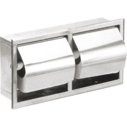 Встраиваемый горизонтальный диспенсер для 2 рулонов туалетной бумаги из нержавеющей стали с защитными колпачками.