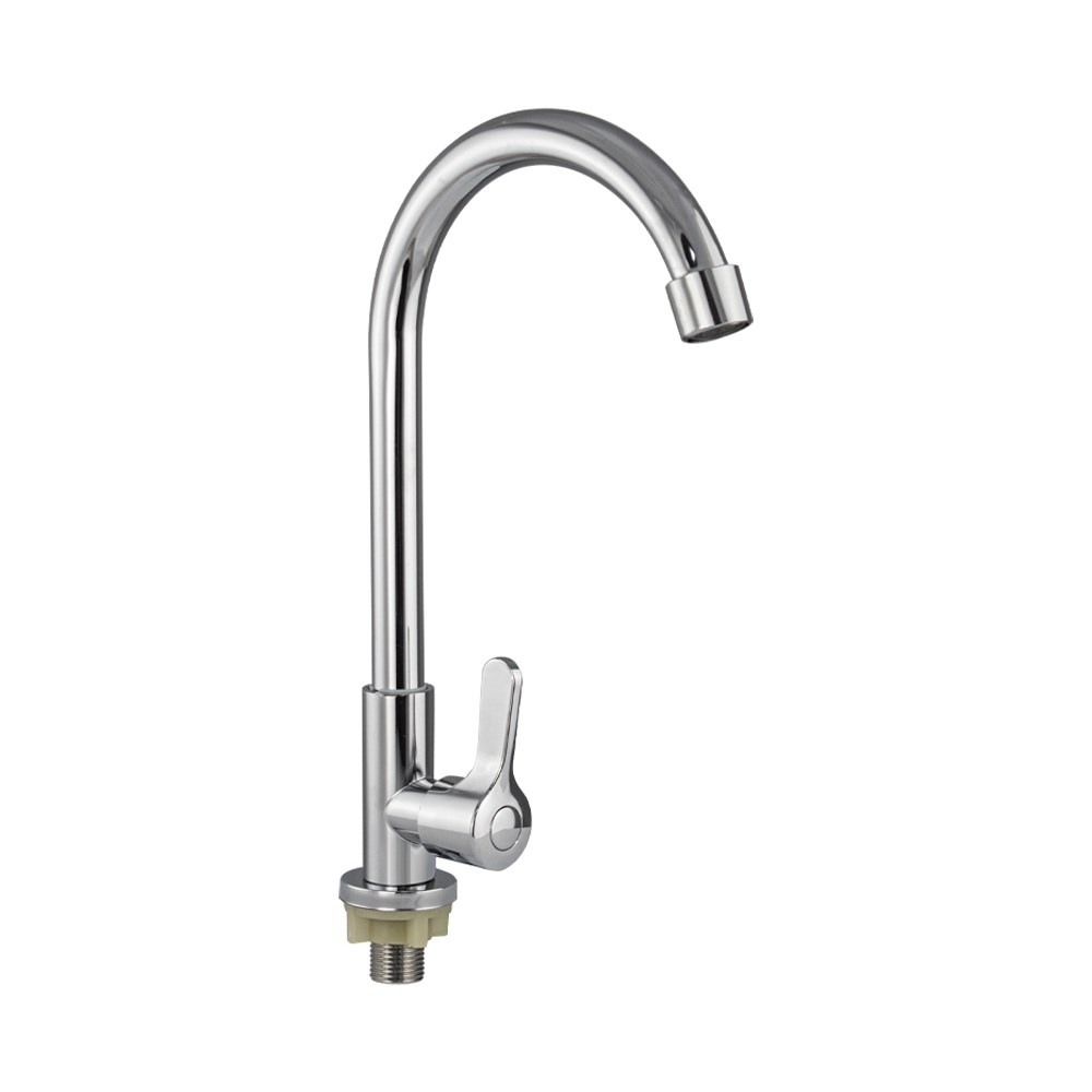 Кран на одну воду для кухонной мойки и раковин, хромированный корпус, из полированной нержавеющей стали марки SUS 304, с высоким С - образным изливом, с аэратором для экономии воды. Крепление резьба - гайка, подключение к водопроводной сети с помощью гибких шлангов с накидной гайкой на 1/2. Кранбукса м/к, ручка шток, поворот на 90?. Такая модель может использоваться на домашней кухне, на даче, в медицинских учреждениях и общественных местах. Габаритные размеры: высота 270 мм, длина 170 мм, диаметр посадочного седла 35 мм, длина резьбы 30 мм. Вес - 0,4 кг, объём - 0,000106 м3. В комплекте корпус с изливом, крепёж.