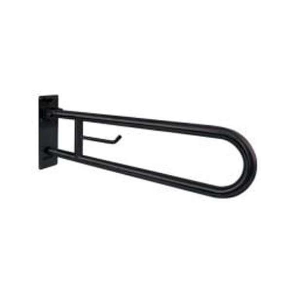 Поручень полукруглый для людей с ограниченными возможностями 600 мм из нержавеющей стали черного матового цвета. С держателем для бумаги. Полукруглый откидной поручень идеально подойдет для комплектации практически любого санузла для людей с ограниченными возможностями. Максимальная нагрузка на эту модель составляет 120 кг, поэтому производитель настоятельно рекомендует использовать в санузле также и другие пристенные поручни