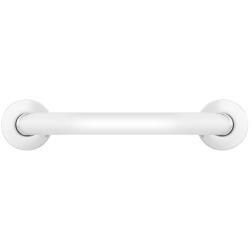 Поручень прямой опорный для крепления на стену, белый. Подходит для поддержки в раковинах, туалетах, душах и ваннах. Предназначен для людей с ограниченными возможностями. Изготовлен из нержавеющей стали AISI 304. Две опорные точки. Длина (между центрами опор): 450 мм. Диаметр ? 32 мм, толщина 1,5 мм. 38 мм от стены. Рекомендуемая высота установки 70-75 см от пола. Крепления включены в комплект.