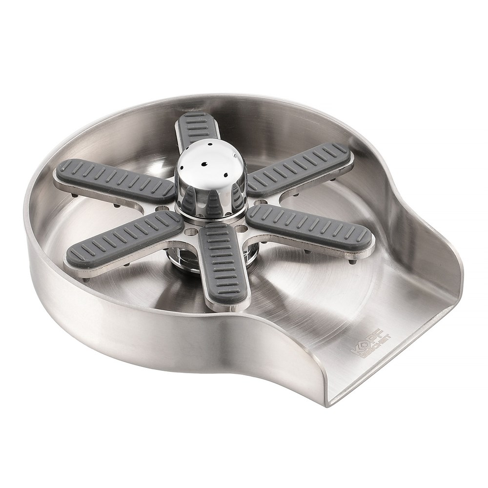 Особенностью этой модели является вращающаяся форсунка, подающая воду. В форсунке несколько отверстий, направленных под разными углами. Поставьте стакан или бокал на основание, покрытое силиконовыми накладками, и надавите на него ладонью. При нажатии форсунка начнет вращаться, равномерно ополаскивая под давлением всю поверхность посуды.