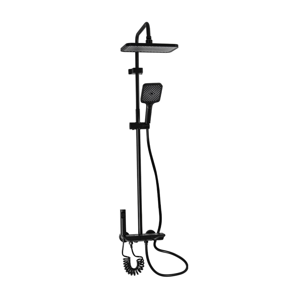 Смеситель + стойка душевая "тропический душ" с двумя душевыми лейками и гигиеническим душем, широкий корпус из АБС пластика с клавишным управлением, цвет ЧЕРНЫЙ.