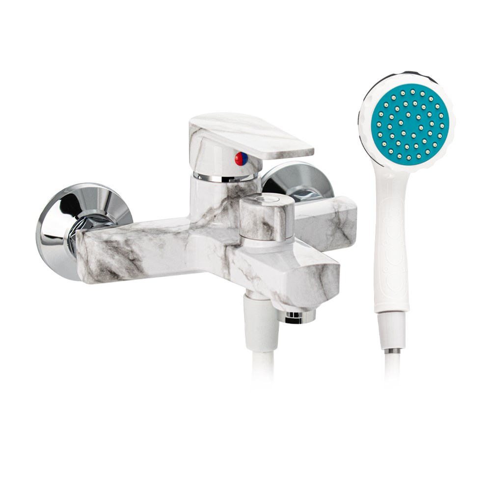 Смеситель из высокопрочного пластика АБС, БЕЛЫЙ МРАМОР в ванную / душевую комнату с коротким изливом, литой корпус, шаровый, с кнопочным дивертором на корпусе. Картридж d = 40 мм, литая ручка, хромированный аэратор для экономии воды, хромированные чашки и эксцентрики. Габаритные размеры: ширина 150 мм, высота корпуса 100 мм, длина излива 90 мм, душевая лейка d = 80 мм, шланг 150 см. Вес - 1,000 кг, объём - 0,00531 м3. В комплекте паспорт, корпус с изливом, дивертор, душевая лейка, шланг, кронштейн, комплект крепежа и прокладок.