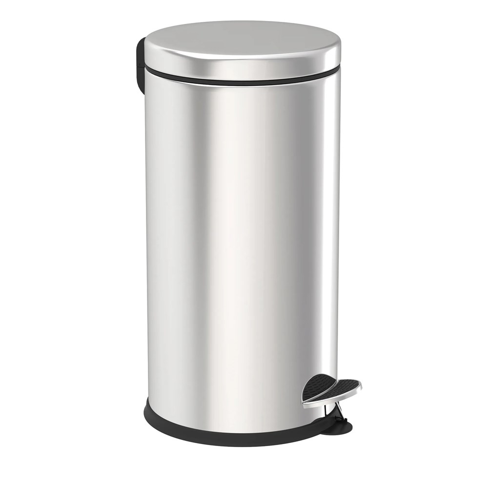 Урна для мусора из нержавеющей стали с пластиковым контейнером внутри. Открытие крышки осуществляется с помощью педали. Форма кругая, установка напольная. Материал: сталь, ударопрочный пластик.