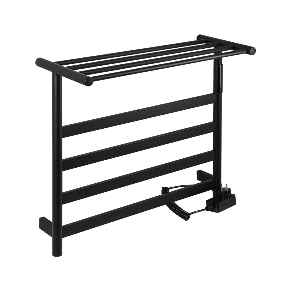 Полотенцесушитель электрический цвет чёрный, лесенка с полкой, из нержавеющей стали, сенсорное управление с таймером до 24 часов, регулировка температуры от 40 до 60 градусов, тэн из углеродного волокна гармонично впишется в современный интерьер и поможет поддержать комфортную атмосферу в ванной комнате, работает вне зависимости от отопительного сезона, и его можно разместить в любом месте ванной или даже на стене в комнате. Сверху нанесено полимерное чёрное покрытие, устойчивое к высоким температурам. Благодаря продуманному расположению труб можно размещать объемный текстиль, сократив время просушки. Установка и ремонт не требуют работы сантехников.Запуск - нажатием одной кнопки. Габариты и параметры: 510 х 575 х 220 мм, на 4 перекладины с сухим ТЭНом, 75 W, 220-230 V, 50-60 Гц, t - 55*C, IP 44. Комплект: полотенцесушитель, крепёж, провод с евровилкой для подключения. Вес - 4,300 кг, объём - 0,05000 м3