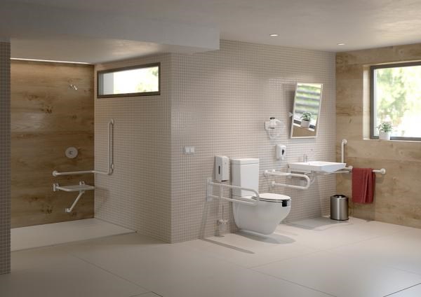 Поручень полукруглый для людей с ограниченными возможностями из нержавеющей стали AISI304. С держателем для бумаги. Поручень откидной устанавливается на стену с помощью 6 винтов крепления, которые поставляются в комплекте с устройством. Максимальная нагрузка на поручень не должна превышать 120 кг, белый, длина 600 мм, диаметр ? 32 мм.