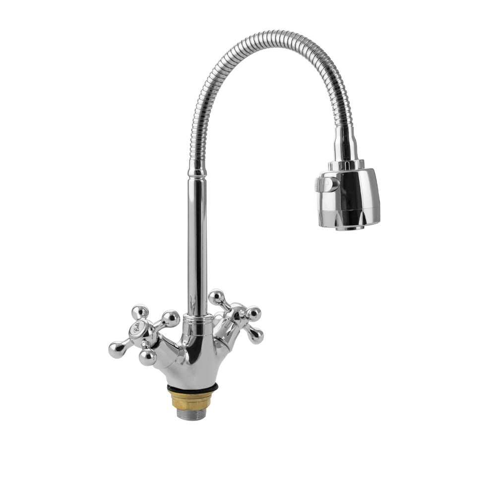 Смеситель для кухонной мойки и раковин, массивный корпус с гибким изливом, хромированный, с двухрежимным аэратором для экономии воды. Материал изготовления — ЦАМ (цинк-алюминий-медь) + нержавеющая сталь. Крепление резьба - гайка. Кранбукса м/к 1/2, ручка крест, поворот на 90?. Габаритные размеры: высота 250 - 310 мм, длина 200 - 250 мм, диаметр посадочного седла 40 мм, длина резьбы 30 мм, длина подводки 350 мм. Вес - 1,400 кг, объём - 0,00500 м3. В комплекте корпус с изливом, паспорт, подводка 1/2, крепёж .