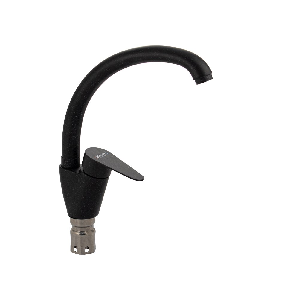 Смеситель для кухонной мойки и раковин, боковой, шаровый, корпус комбинированный, чёрная матовая эмаль с вкраплениями и с хромом, с высоким С-образным изливом, Материал изготовления — нержавеющая сталь. Крепление резьба - гайка, картридж d = 40 мм, ручка с прорезью. Аэратор для экономии воды. Габаритные размеры: высота 280 мм, длина 250 мм, диаметр посадочного седла 50 мм, длина резьбы 55 мм, длина подводки 500 мм. Вес - 1,100 кг, объём - 0,00420 м3. В комплекте паспорт, корпус с изливом, подводка 1/2, крепеж, набор прокладок.