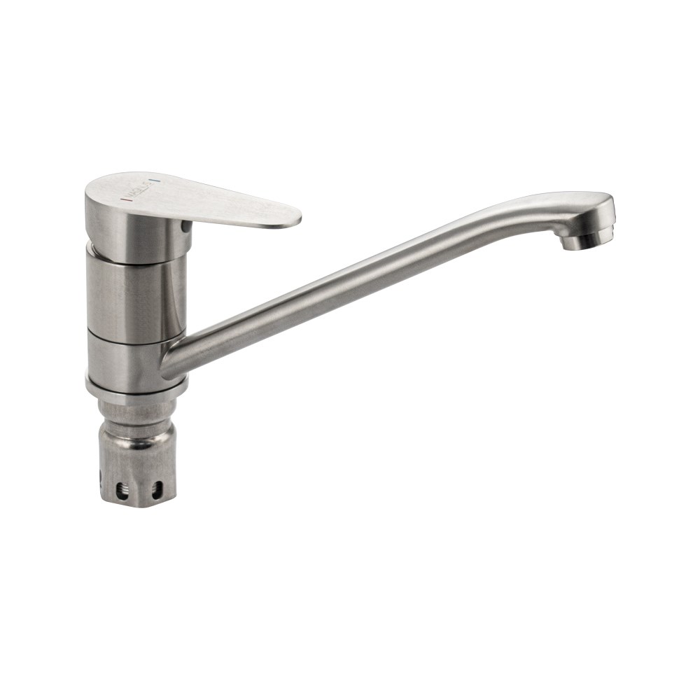 Смеситель для кухонной мойки и раковин, литой матовый корпус с длинным, поворотным изливом 25 см, из нержавеющей стали марки 304, шаровый. Крепление резьба - гайка, картридж d = мм, ручка литая. Аэратор для экономии воды. Такая модель может использоваться на домашней кухне, на даче, в медицинских учреждениях и общественных местах. Габаритные размеры: высота 150 мм, длина 260 мм, диаметр посадочного седла 50 мм, длина резьбы 55 мм, длина подводки 500 мм. Вес - 0.95 кг, объём - 0.00260 м3. В комплекте паспорт, корпус с изливом, подводка 1/2, крепеж, набор прокладок.