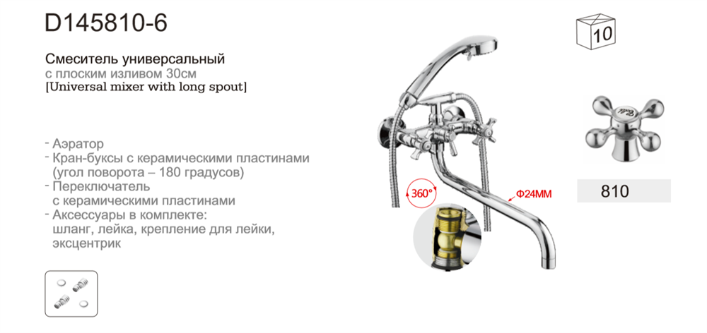 Смеситель для ванны с круглым изливом D145810-6, шланг, лейка, крепление для лейки, эксцентрик