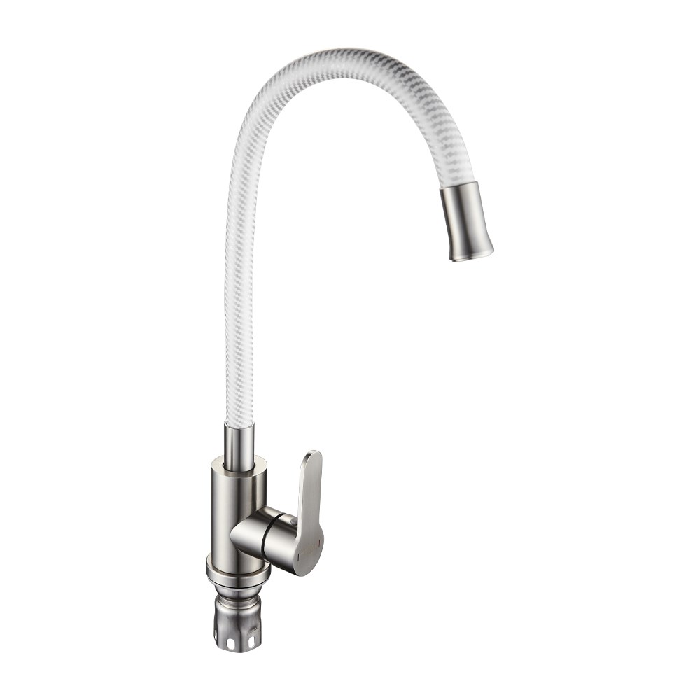 Смеситель для кухонной мойки и раковин, литой матовый корпус, из нержавеющей стали марки 304, с высоким гибким изливом белого цвета, полосатый, с аэратором для экономии воды, шаровый. Крепление резьба - гайка, картридж d = 35 мм, ручка литая. Такая модель может использоваться на домашней кухне, на даче, в медицинских учреждениях и общественных местах. Габаритные размеры: высота 300 - 400 мм, длина 250 - 350 мм, диаметр посадочного седла 50 мм, длина резьбы 60 мм, длина подводки 400 мм. Вес - 2,000 кг, объём - 0,00500 м3. В комплекте паспорт, корпус с изливом, подводка 1/2, крепеж, набор прокладок.