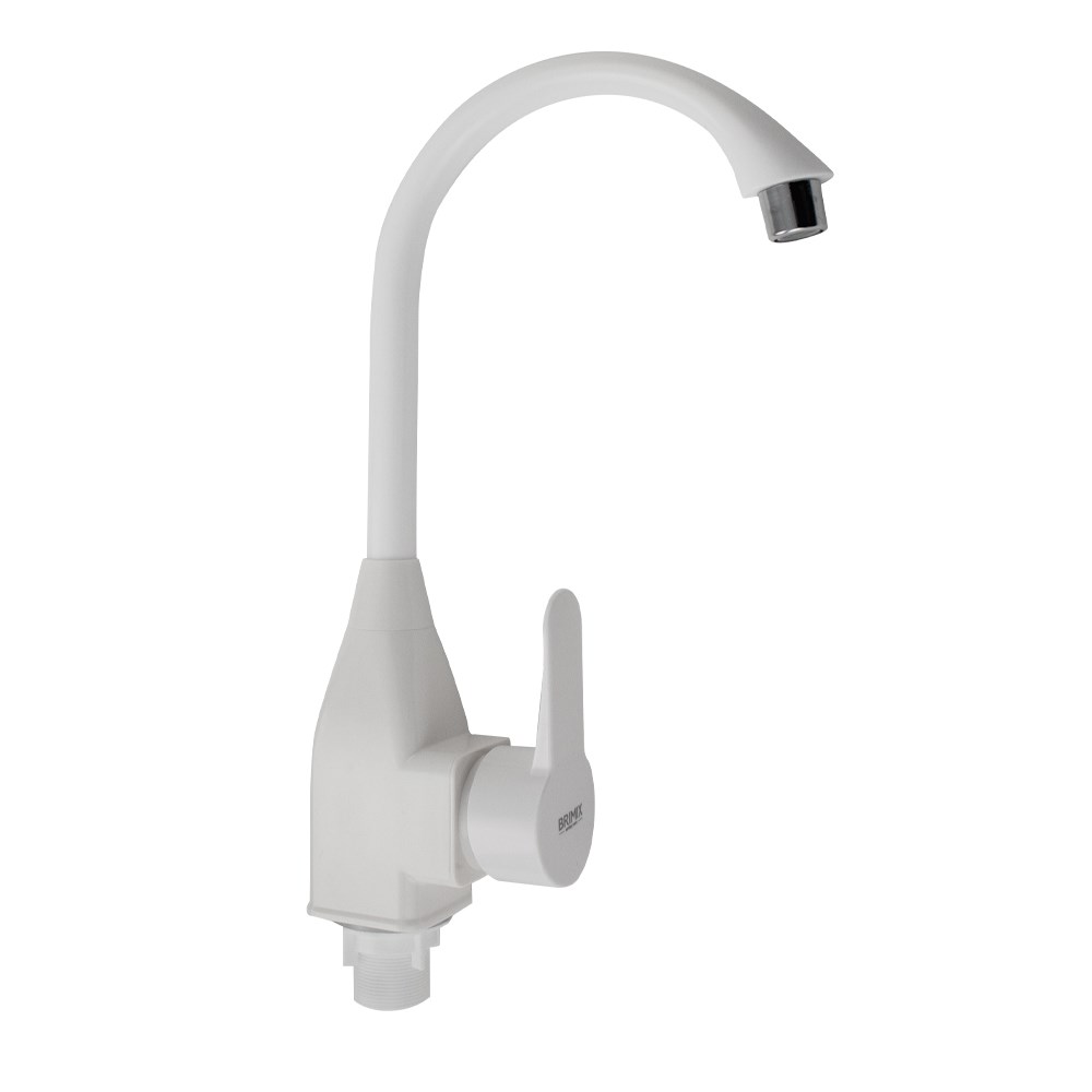 Смеситель для кухонной мойки и раковин, из высокопрочного пластика АБС, БЕЛЫЙ боковой, с высоким С-образным изливом, шаровый. Крепление резьба - гайка, квадратный корпус, картридж d = 40 мм, литая ручка. Хромированный аэратор для экономии воды. Габаритные размеры: высота 330 мм, длина 210 мм, диаметр посадочного седла 50 мм, длина резьбы 40 мм, длина подводки 400 мм. Вес - 0,650 кг, объём - 0,00541 м3. В комплекте паспорт, корпус с изливом, пластиковая подводка с латунными штуцерами 1/2, крепеж, набор прокладок.