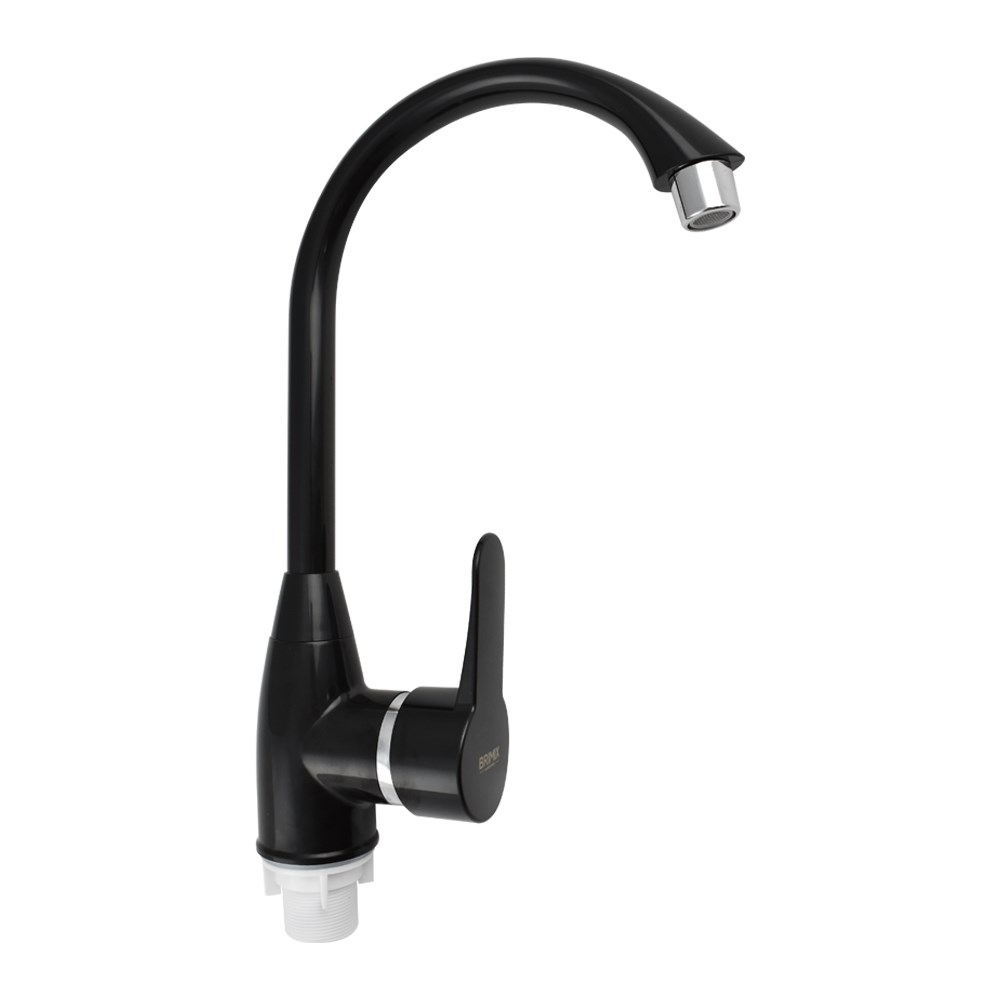 Смеситель для кухонной мойки и раковин, из высокопрочного пластика АБС, ЧЁРНЫЙ, боковой, с высоким С-образным изливом, шаровый. Крепление резьба - гайка, картридж d = 40 мм, литая ручка. Хромированный аэратор для экономии воды. Габаритные размеры: высота 310 мм, длина 210 мм, диаметр посадочного седла 50 мм, длина резьбы 40 мм, длина подводки 400 мм. Вес - 0,600 кг, объём - 0,00491 м3. В комплекте паспорт, корпус с изливом, пластиковая подводка с латунными штуцерами 1/2, крепеж, набор прокладок.