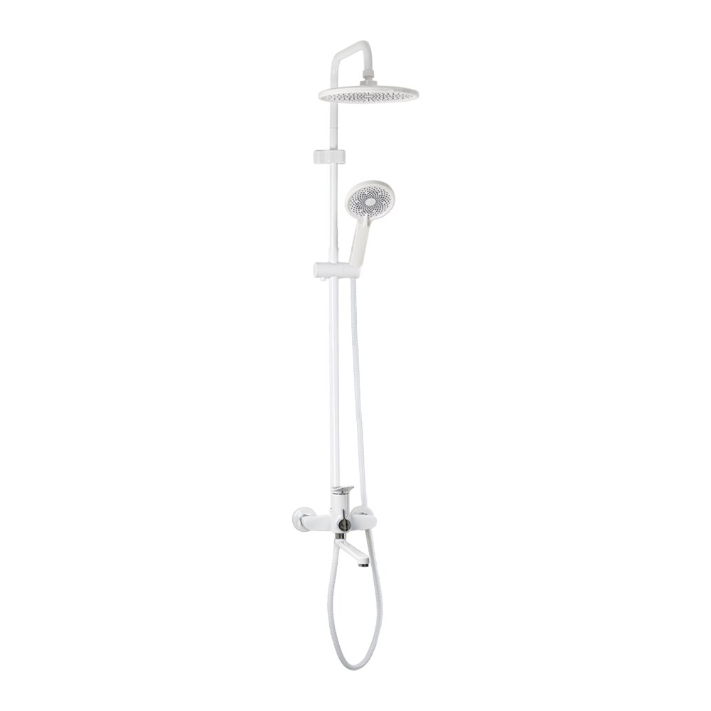Смеситель + стойка душевая телескопическая "тропический душ" с двумя лейками в ванную / душевую комнату, хромированный с покрытием белая эмаль. Смеситель шаровый с длинным поворотным изливом, душевым шлангом и лейкой, дивертор переключения в трёх положениях. Материал изготовления — латунь. Картридж d = 40 мм, ручка литая, аэратор для экономии воды, чашки и эксцентрики. Душевая, регулируемая по высоте стойка с присоединением к корпусу смесителя и дополнительным креплением к стене и большой круглой лейкой с эффектом тропического душа. Габаритные размеры: ширина смесителя 150 мм, высота 150 мм, длина излива корпуса 300 мм, высота телескопической стойки 800-1200 мм, длина излива стойки 320 мм, круглая душевая лейка 120 мм, круглая лейка тропический душ 225 мм, шланг 150 см. Вес - 4.12 кг, объём - 0.02847 м3. В комплекте корпус с изливом, чашки, эксцентрики, прокладки, стойка, дивертор, шланг, две лейки, крепления.