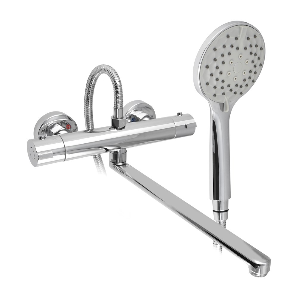 Смеситель в ванную, длинный излив с ТЕРМОСТАТОМ, корпус 100% ЛАТУНЬ