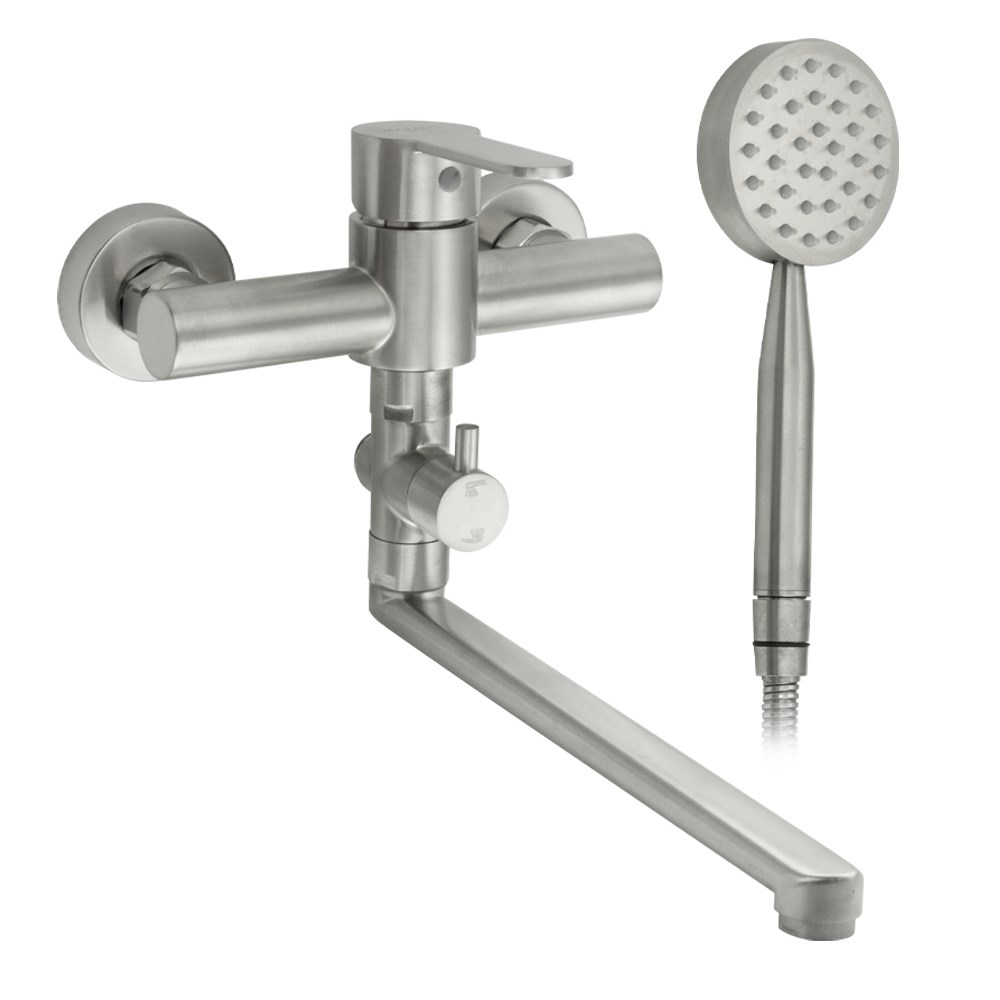 Смеситель матовый, из нержавеющей стали марки 304, в ванную / душевую комнату, с поворотным длинным плоским изливом. Картридж d = 40 мм, ручка литая. Дутый, большой круглый корпус с дивертором м/к, аэратор для экономии воды, чашки, гайки и эксцентрики из нержавеющей стали. Габаритные размеры: ширина 150 мм, высота 170 мм, длина излива 330 мм, диаметр чашки 60 мм, длина шланга 150 см, лейка d = 85 мм. Вес - 2,100 кг, объём - 0,00620 м3. В комплекте корпус с изливом, дивертор, паспорт, крепёж, кронштейн, прокладки, лейка, шланг.